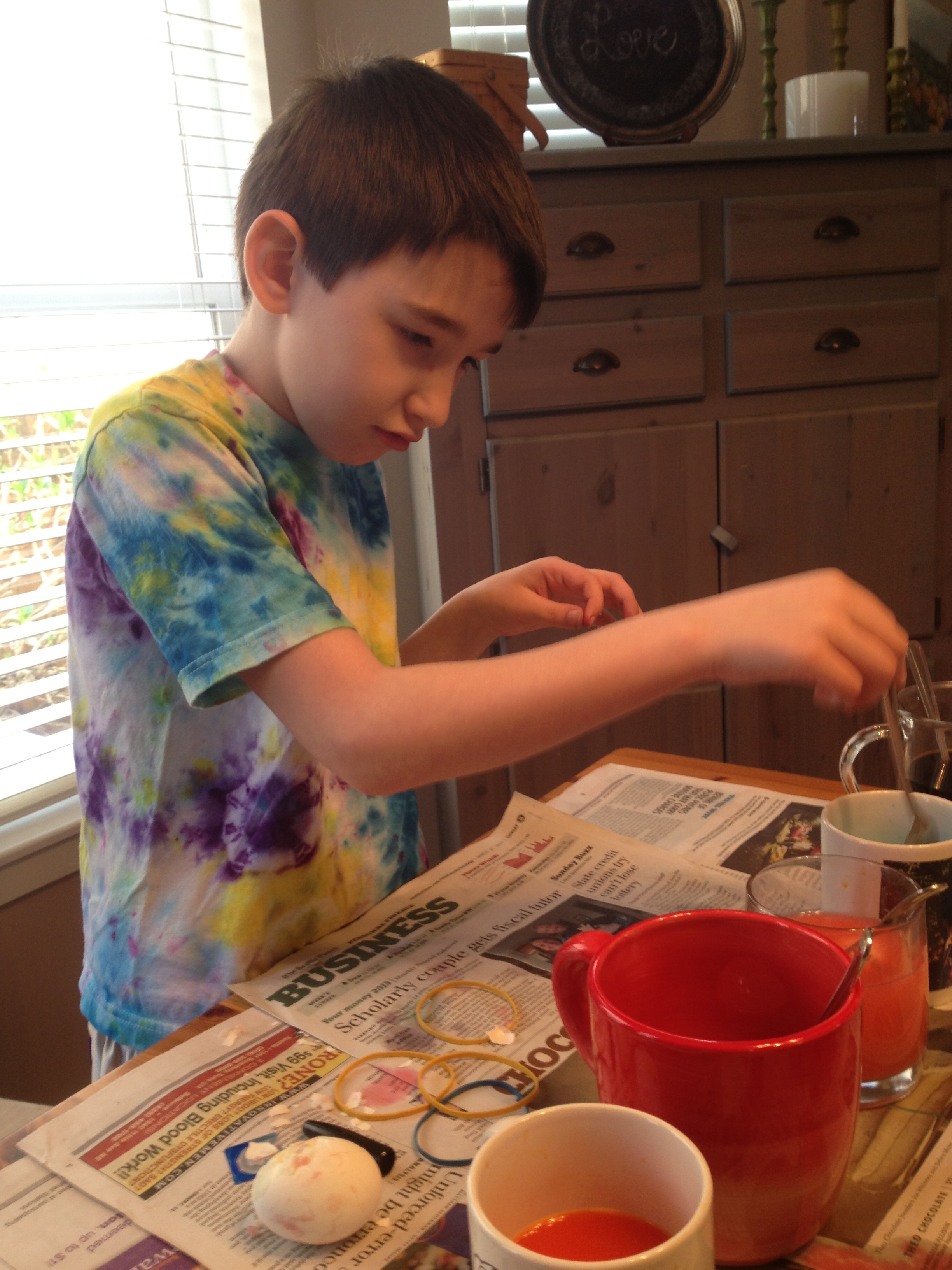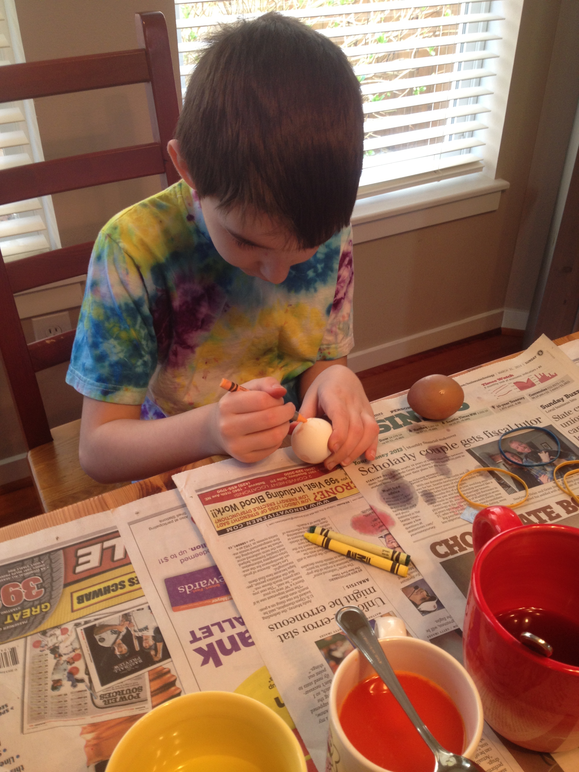 On Saturday, we did our traditional egg dying.  This year, we tried a new technique and used individual packets of Kool-Aid flavors.  The jury is still out on whether we preferred the old Paas and vinegar method or the new fruity-fragranced Kool-Aid.  I thought the icy blue lemonade (blue), wild cherry (red), and orange were very successful.  The lemonade was too light and pink lemonade turned out to be a very soft pink.  The grape turned out gray.  We created a truly ugly egg by peeling it and putting it right in the muddy liquid-the benefit of using the Kool-Aid.  We decided that these would be fabulous for a Halloween party.  In addition to the colors, we used Sharpie marker, crayons & rubber bands.  I don’t believe they are contest winners but, we had fun 🙂