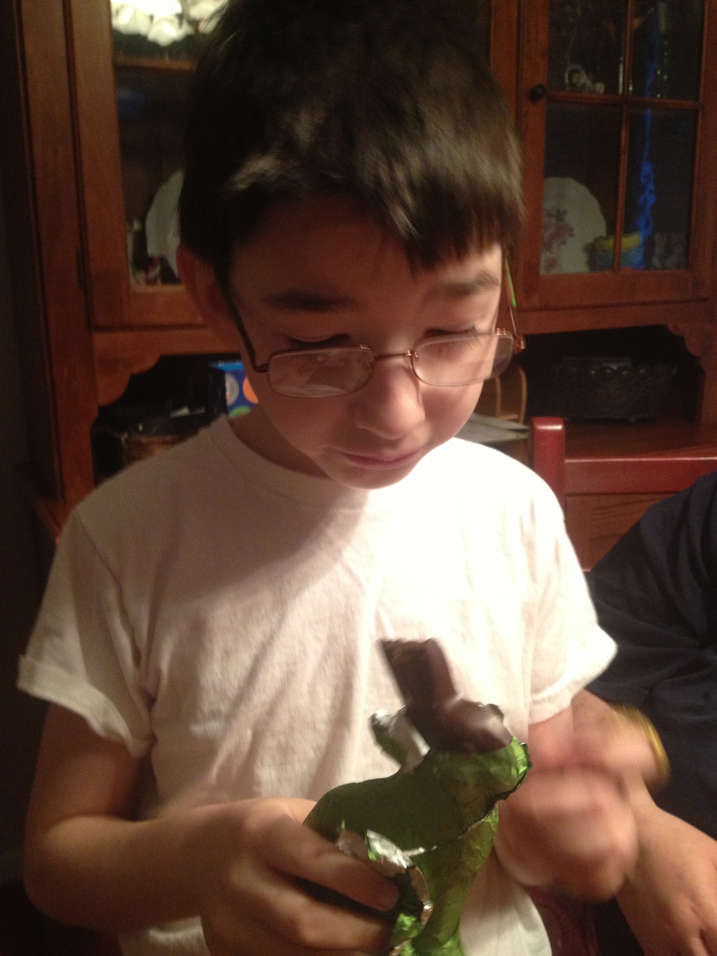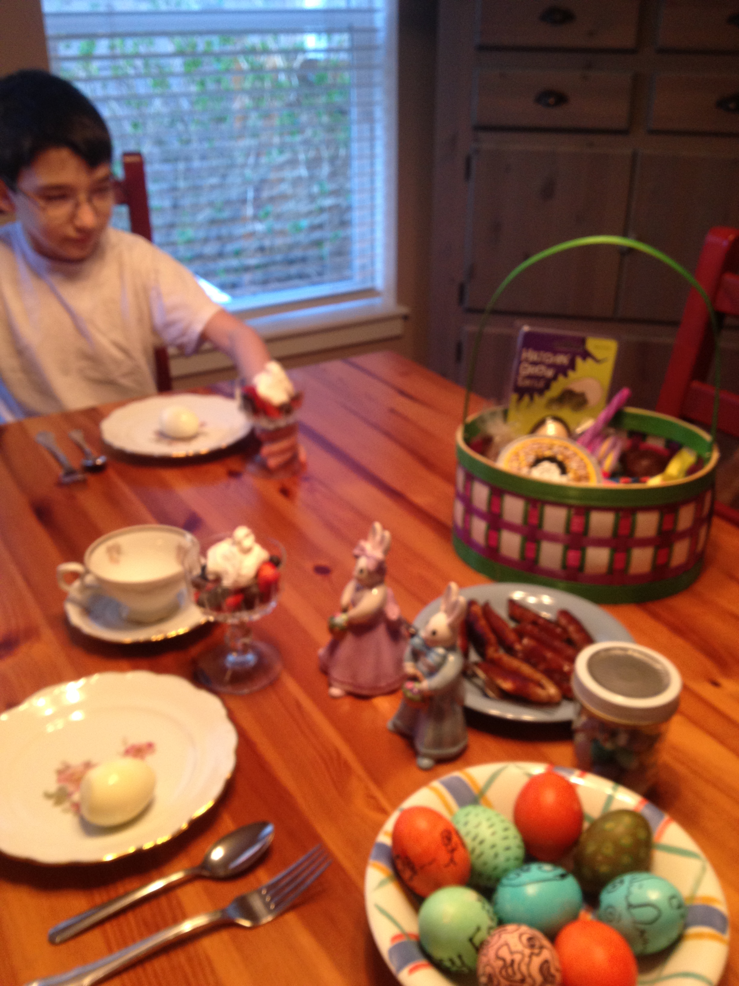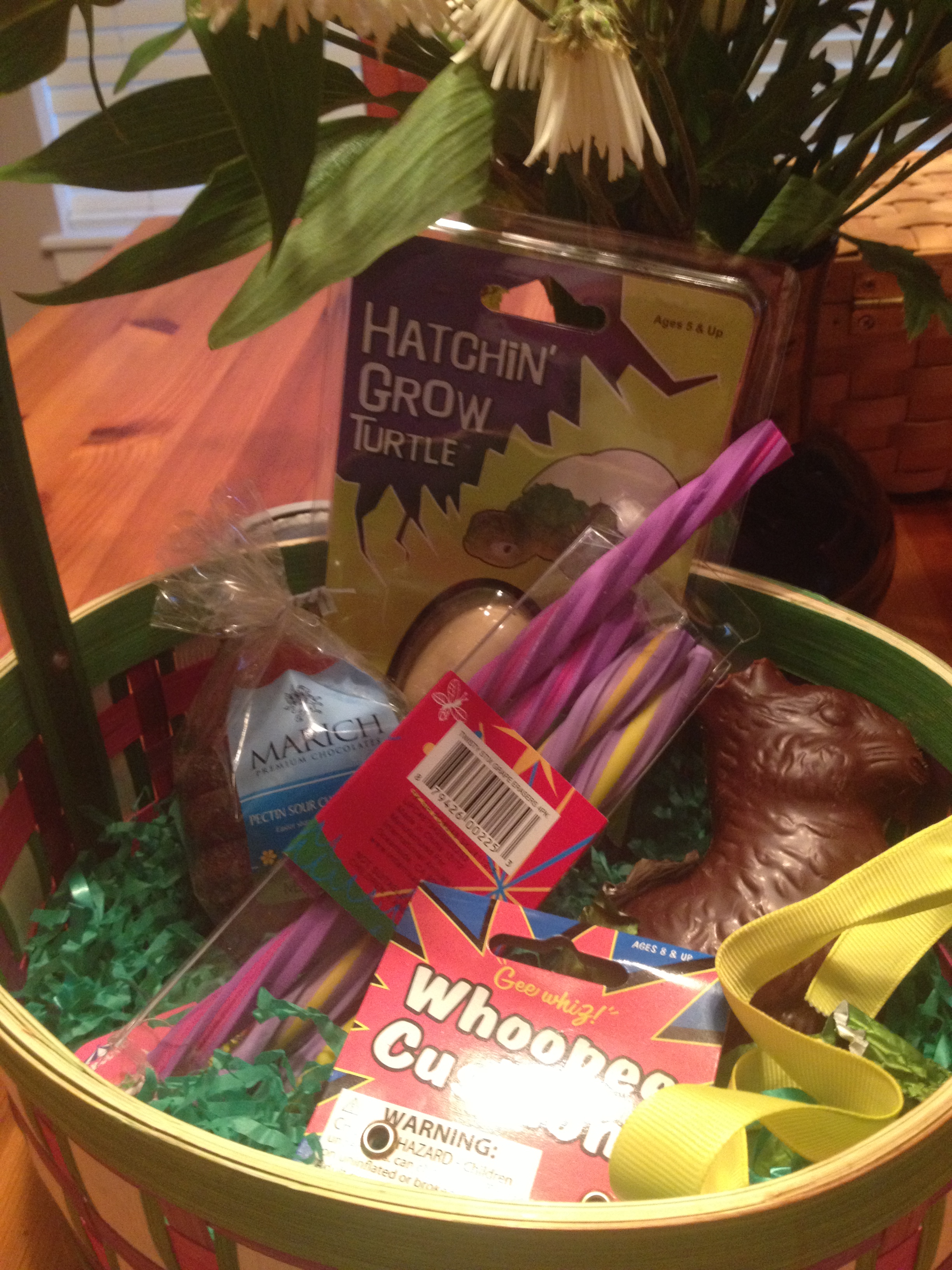 Sunday morning, the Easter Bunny arrived and didn’t disappoint!   Candy, scented erasers, growing turtle, Crazy Aaron’s Thinking Putty, and yes…a whoopee cushion all made for a great basket!  After a bit of early sweet tasting, we had breakfast and gathered our things for Granny and Grampy’s house.