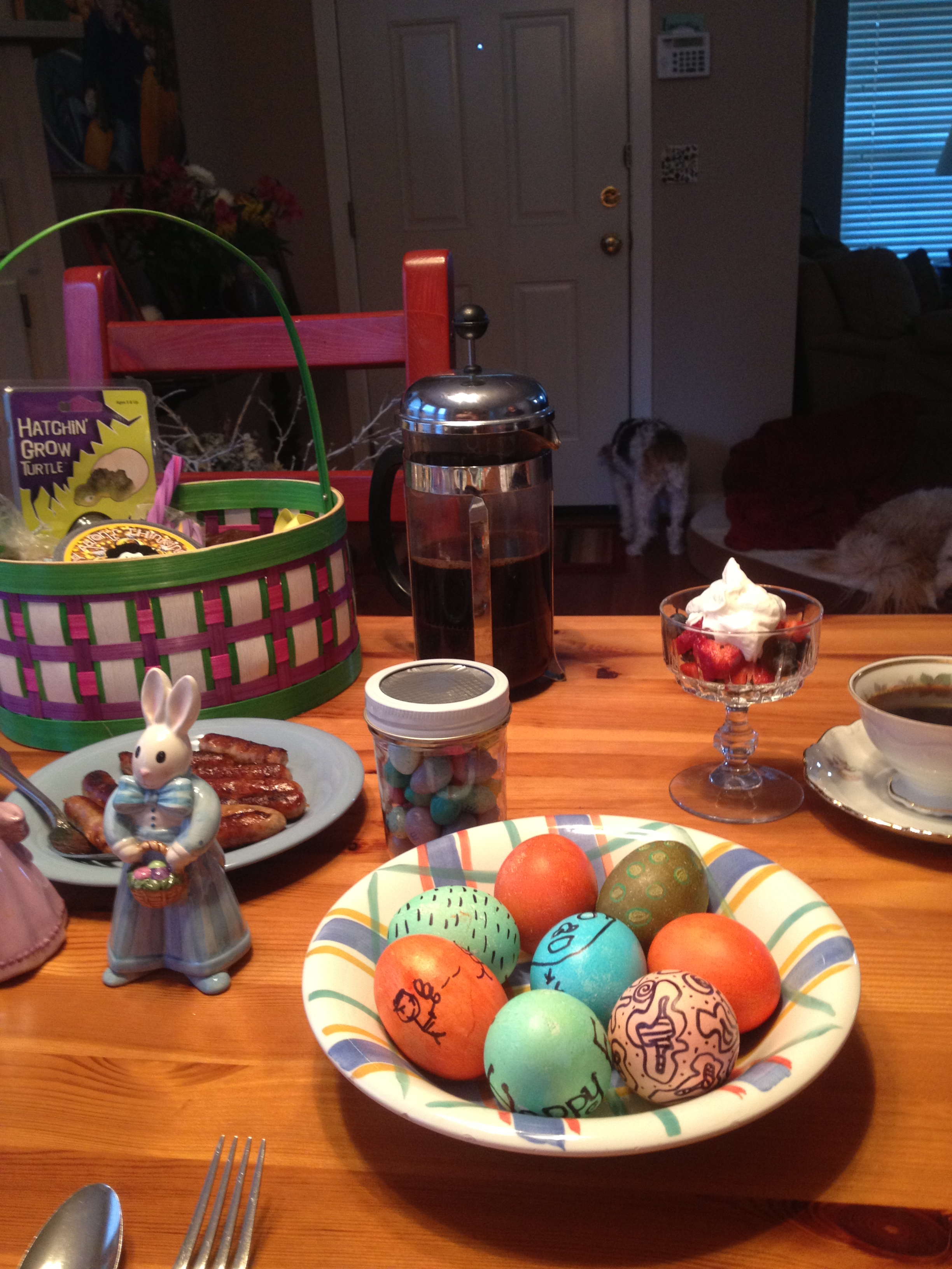 I have included pictures of our Kool-Aid egg dying, the Easter basket, breakfast, our egg hunt & one of the family dog sneaking a bit of Easter snacks!